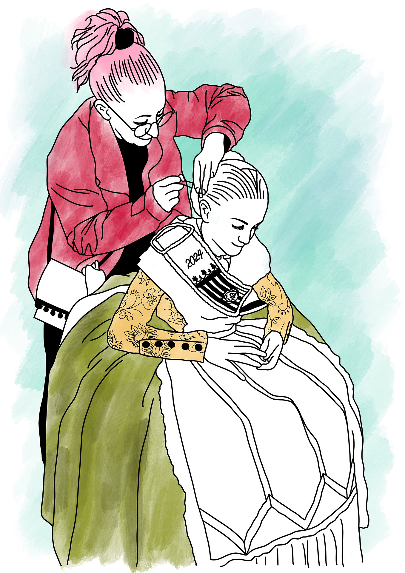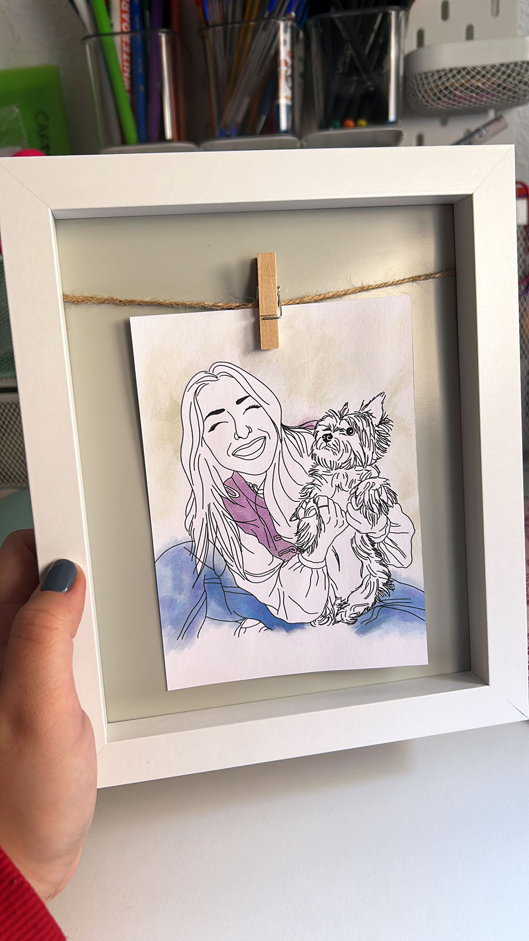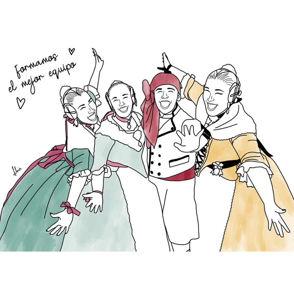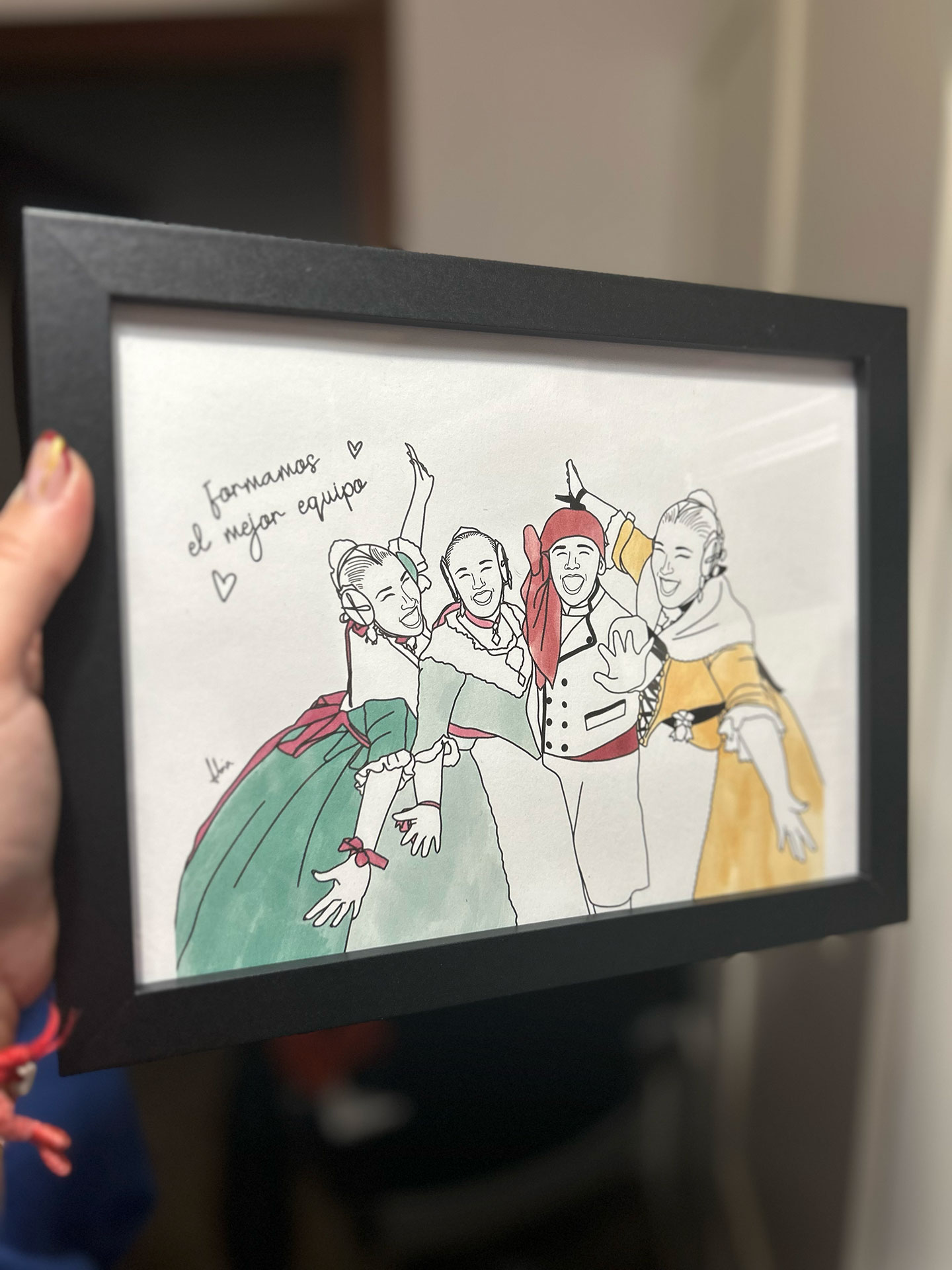 ¿Te mola la idea de hacer un regalo original pero con ese toque moderno y elegante? Pues nuestra ilustración a línea es justo lo que necesitas. Es un retrato chulísimo, dibujado con un estilo limpio y que sienta genial en cualquier pared. Puedes incluir a tu gente favorita ¡y también a tus mascotas! Y sí, si buscas un detalle para esas Falleras Mayores o Infantiles, un recuerdo artístico y fino de su gran año.
