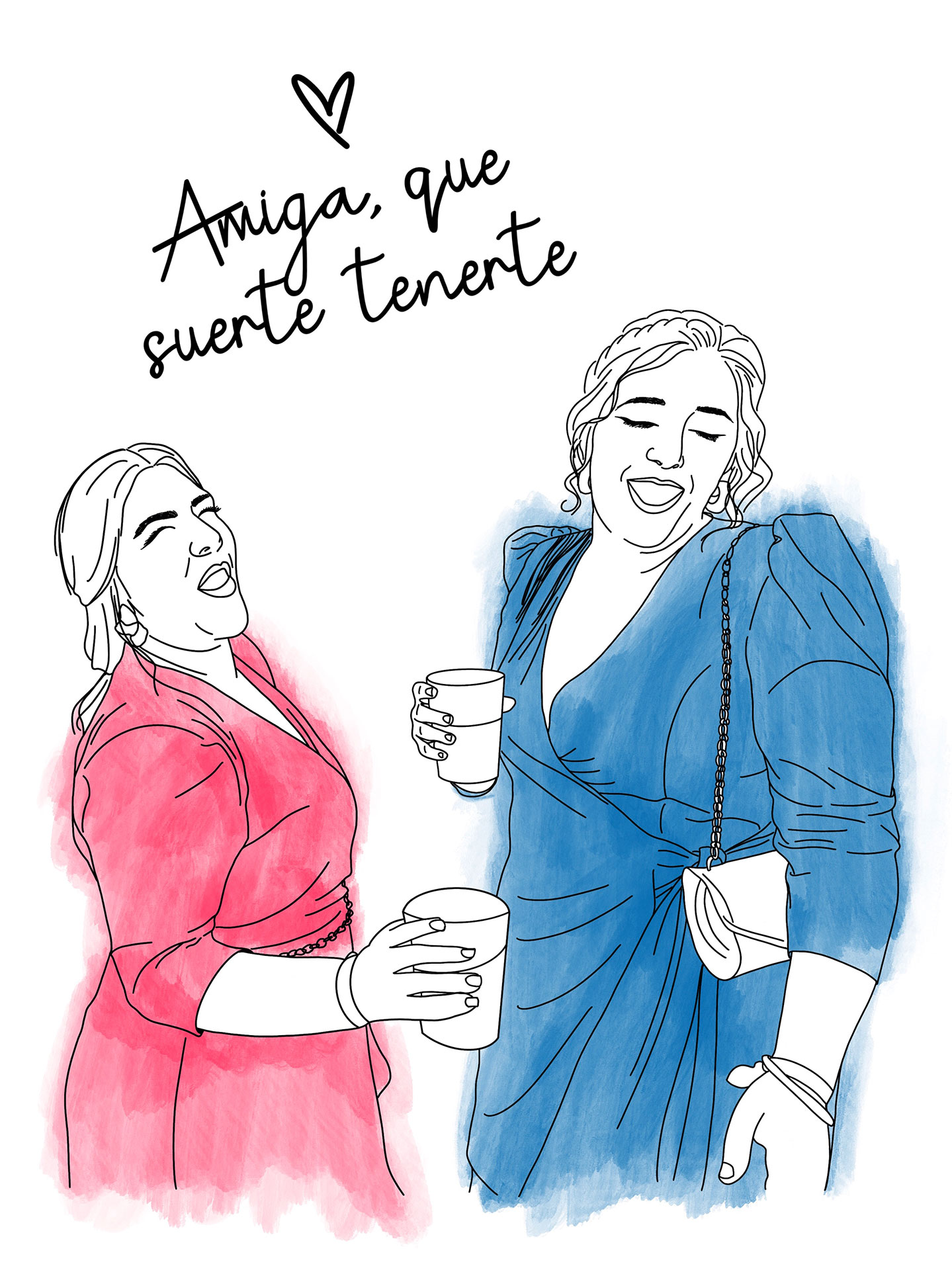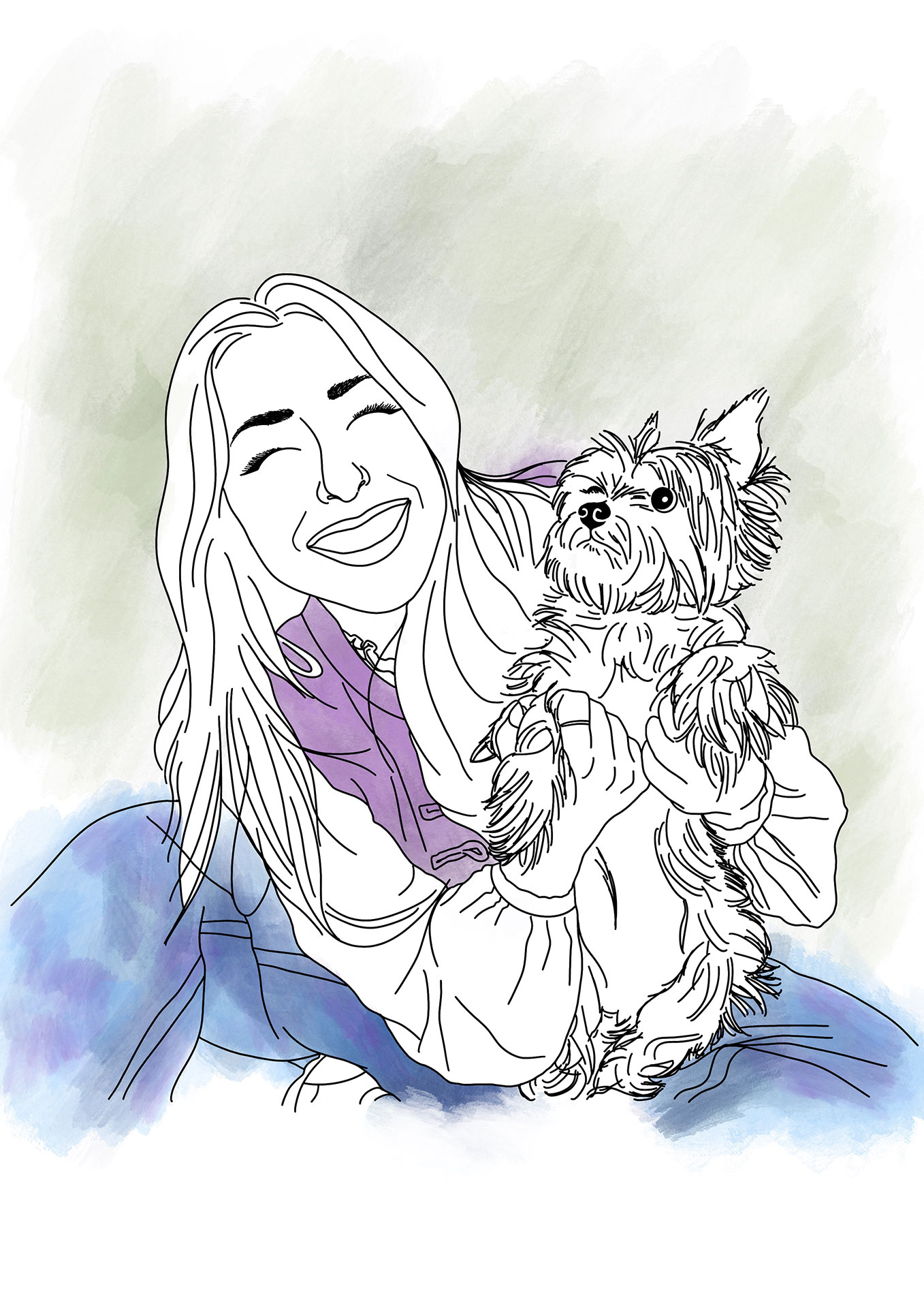 El fondo es siempre blanco para que el dibujo destaque, pero el truco está en que metemos color en la ropa para darle ese puntazo vibrante. Simplemente dinos cuántas personas y cuántos peludos quieres que salgan y mándanos la foto que más te guste.